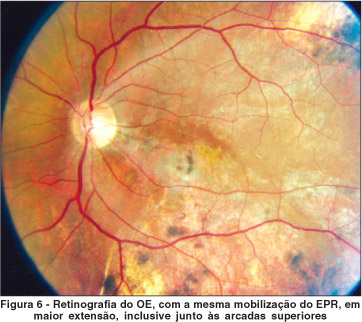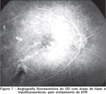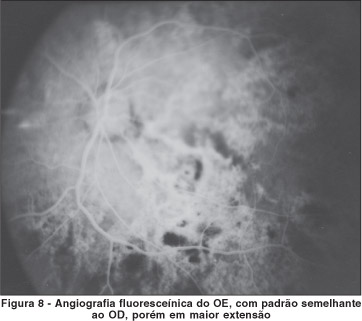 Ao exame oftalmológico, apresentava acuidade visual corrigida igual a 1,0 no olho direito (OD) e 0,5 no olho esquerdo (OE). Não tinha alterações na biomicroscopia e na tonometria. O exame da grade de Amsler e o teste de Ishihara eram normais. A fundoscopia mostrou maior acometimento do OE (Figuras 5 e 6), com a maior parte das lesões além das arcadas vasculares. A angiografia fluoresceínica evidenciou o moteamento do EPR (Figuras 7 e 8).