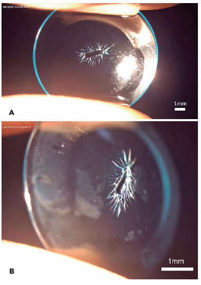 An 11-year-old girl presented to our clinic with a fractured lens in her right eye following two years of orthokeratology lens wear. The central area of the lens appeared feathery, indicating damage, while the surrounding area was unaffected. Fluorescence staining confirmed the corneal integrity, indicating that the damage was the result of the negative pressure generated when using a tool to remove the lens from the central region. This highlights the importance of proper care and handling during the fitting and maintenance of orthokeratology lenses(1). Contact lens users are predisposed to complications such as bacterial colonization(2), corneal abrasions(3), and suboptimal outcomes. Therefore, proper lens maintenance and adherence to careful application and removal techniques are crucial. The lens should be removed from the periphery to avoid generating excessive negative pressure at the center, thereby preventing corneal adhesions and potential damage(4).