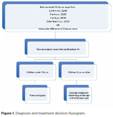 Currently, guidelines for amblyopia treatment and follow-up have not been established in Brazil. Early diagnoses of ocular changes associated with amblyopia are essential for good visual prognoses because treatment can be started at a stage when the visual neurological pathways are still responsive to stimulation, recovery, and reversal of cortical damage. Therefore, we aimed to propose amblyopia treatment and follow-up guidelines for Brazilian ophthalmologists.
