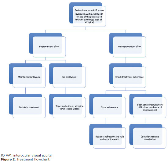 Treatment should be continued until VA is equalized in both eyes or stabilized at a plateau. Once maximal VA is achieved, treatment should be tapered off slowly (for at least 5 weeks) before being stopped. Follow-up visits are still necessary even with discontinued treatment to assess any regression. Recurrence occurs in approximately a quarter of successfully treated children within the first year after treatment discontinuation, and it may occur in patients who discontinue the occlusion, as well as in those who discontinue penalization with atropine(95,96).Figure 3 shows the follow-up flowchart.