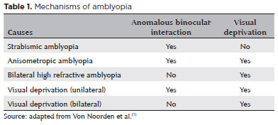 The major causes of deprivation amblyopia are infantile cataracts, blepharoptosis, and corneal opacities. Unilateral deprivation amblyopia is more severe than bilateral deprivation amblyopia because of the superimposed mechanisms of binocular anomalous interaction and visual deprivation(21-23).