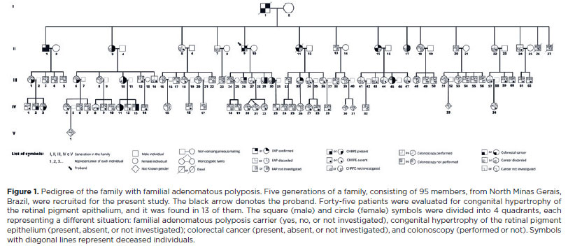 The aim of this study was to identify CHRPE lesions in patients diagnosed with FAP and their relatives who belonged to a large Brazilian family. Additionally, we aimed to describe the pattern of distribution and characteristics of the lesions, which will help in clarifying the role of CHRPE as a phenotypical marker of FAP. Furthermore, we identified the germline mutation in the APC gene that caused the disease.