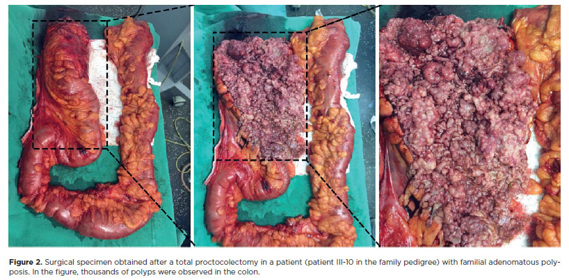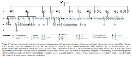 This study was a cross-sectional and descriptive study. The proband with FAP was referred by a gastrointestinal surgeon from the research group. Five generations of the patient's family (comprising of 95 members) from the northern region of Minas Gerais State, Brazil, were analyzed. Details of the family health history were collected, and a pedigree chart was constructed (Figure 1). The father had died of colon cancer at the age of 55 years and was probably the carrier of the affected gene. He may have been unaware that he was a carrier of the genetic condition. The index case belonged to the second generation of the family. He was diagnosed with FAP after colorectal cancer (CRC) was detected, and it was associated with several colonic polyps. The study was carried out from December 2018 to April 2022.