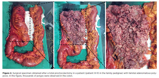 Genetic analysis was performed to identify the mutation associated with FAP in this family. The APC gene was sequenced, and the genomic DNA was isolated from oral epithelial cells. After the genomic DNA was extracted and fragmented, it was indexed and captured with custom probes. Furthermore, the regions of interest were enriched. After next generation sequencing of the target sequences (Illumina), they were aligned and variants were detected on the basis of the GRCh37 version of the human genome. The generated data were analyzed using customized bioinformatics processes (germline pipeline version 3.6). The variants were interpreted by considering the patient's clinical condition and the variant classification protocol of the American College of Medical Genetics.