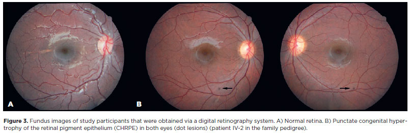 METHODS: A family consisting of 95 individuals was evaluated. Among these, 45 individuals were randomly selected by convenience sampling method to undergo ophthalmological evaluation. A funduscopic exam, including slit lamp and indirect ophthalmoscopy, were performed in the selected patients. In those with retinal lesions, a retinography was obtained. The adenomatous polyposis coli gene was sequenced in one affected family member to identify the pathogenic mutation. Once the variant was identified, six undiagnosed family members were tested for the mutation via capillary electrophoresis sequencing.