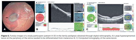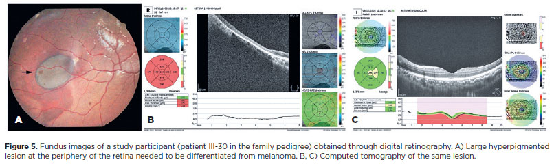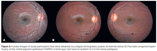 All family members were invited to undergo an ophthalmological evaluation regardless of a confirmed diagnosis of FAP or age. A total of 45 individuals were examined by an ophthalmologist for CHRPE via a funduscopic examination, including slit lamp and indirect ophthalmoscopy (with 90 and 20 diopter lenses, respectively), after the pupil was dilated with 1% tropicamide. The visual acuity of all the individuals was also evaluated. The lesion characteristics such as number, location in the retina, shape, and laterality were evaluated and documented in the medical records by the ophthalmologist, who was unaware of the patient's disease status. In individuals with retinal lesions, fundus photographs were obtained (Retinographic Canon®; Canon Inc., Ōta, Tokyo, Japan). All retinography images were analyzed by the same ophthalmologist and the characteristics of the lesions were documented.