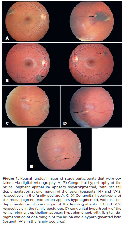 RESULTS: Congenital hypertrophy of the retinal pigment epithelium was observed in 13 (28.9%) of the 45 individuals evaluated. Of these, nine patients were confirmed to have familial adenomatous polyposis (via colonoscopy or molecular testing). However, four patients had not been investigated. Of the 32 (71.1%) family members without the lesion, 14 did not have familial adenomatous polyposis and 18 were yet to be evaluated. The lesions were bilaterally present and exhibited a peculiar fish-tail shape in all the evaluated individuals. Adenomatous polyposis coli gene sequencing revealed a pathogenic variant c.4031del. (Ser1344*), in heterozygosity (49.27%), in exon 16.
