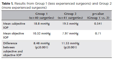 RESULTS: The study comprised 81 surgeries (81 eyes) performed by 27 surgeons. The mean objective intraocular pressure (9.14 mmHg; SD=5.86) was statistically significantly lower (p<0.001) than the mean subjective intraocular pressure (19.21 mmHg; SD=4.82). Hypotony (intraocular pressure <6mmHg) was observed in 25 eyes (30.86%). The mean subjective intraocular pressure was 18.8 mmHg (SD=5.19) for less experienced surgeons and 19.5 mmHg (SD=4.46) for more experienced, without statistically significant difference (p=0.541). No statistically significant difference (p=0.71) was observed when comparing objective intraocular pressure in Group 1 (10.32 mmHg; SD=6.65) and Group 2 (7.97 mmHg; SD=4.7).