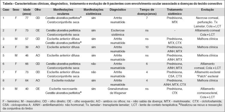 Foram atendidos nove pacientes com quadro de esclerite e/ou ceratite ulcerativa periférica secundários a doenças do tecido conectivo no ambulatório de doenças externas oculares e córnea no período deste estudo (julho/1999-dezembro/2000). Destes pacientes, cinco (56%) eram sabidamente portadores de artrite reumatóide e em quatro pacientes (44%) o diagnóstico da doença subjacente foi realizado a partir da avaliação clínica e da investigação laboratorial, iniciados após o aparecimento da lesão ocular que evidenciaram que dois pacientes eram portadores de artrite reumatóide (casos 3 e 5), um de esclerose sistêmica (caso 2) e outro de granulomatose de Wegener (caso 9). Todos os casos são apresentados na tabela.