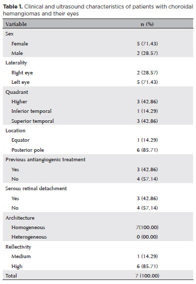 RESULTS: The sample included seven patients (five female) with a median age of 61 (62.29 ± 13.83) years. There were seven eyes with circumscribed choroidal hemangiomas in the patient sample. Color Doppler detected internal vascular flow in all cases (100%). The lesions had an average diameter/thickness ratio of >2 mm and an average thickness of <5 mm and were predominantly located superiorly and supero-temporally.