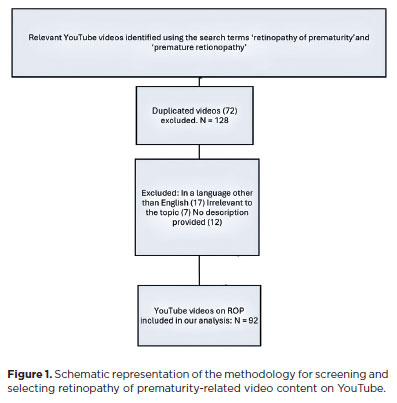 For this cross-sectional study, we performed YouTube searches on August 20, 2023, using the search terms "retinopathy of prematurity" and "premature retinopathy". We kept the site's default search settings, which were set to organize videos by relevance. The initial 100 videos returned for each search term were assessed for inclusion in the study. Our exclusion criteria were duplicates of videos already included videos that were commercial in nature, those in languages other than English, those without narration, those irrelevant to ROP, and videos shorter than 15 seconds. The search process was conducted without signing into a user account and with a cleared search history. This study was approved by the local ethics committee.