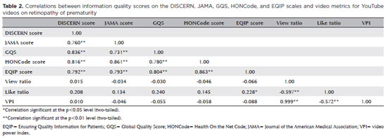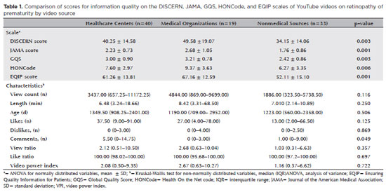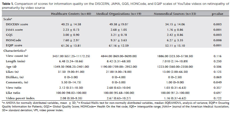 RESULTS: The study assessed 92 videos, the majority of which (42 videos, 45.7%) originated from the United States. Most of the videos focused on screening, pathophysiology, and diagnosis of retinopathy of prematurity (61.9%). The primary contributors were medical organizations (19 videos, 20.6%), nonacademic health channels (19 videos, 20.6%), and physicians (15 videos, 16.3%). Significant differences were found between the DISCERN (p=0.003), JAMA (p=0.001), Global Quality Score (p=0.003), Health on the Net Code of Conduct (p=0.006), and Ensuring Quality Information for Patients (p=0.001) scores among different video sources. However, the key video metrics did not differ. Using the DISCERN and Global Quality Score scales, the overall YouTube video content on retinopathy of prematurity was rated as moderate in quality. Using the Health On the Net Code of Conduct and Ensuring Quality Information for Patients scales, it was rated as high quality. Strong correlations were observed between the scores on all of the scales (p<0.001).