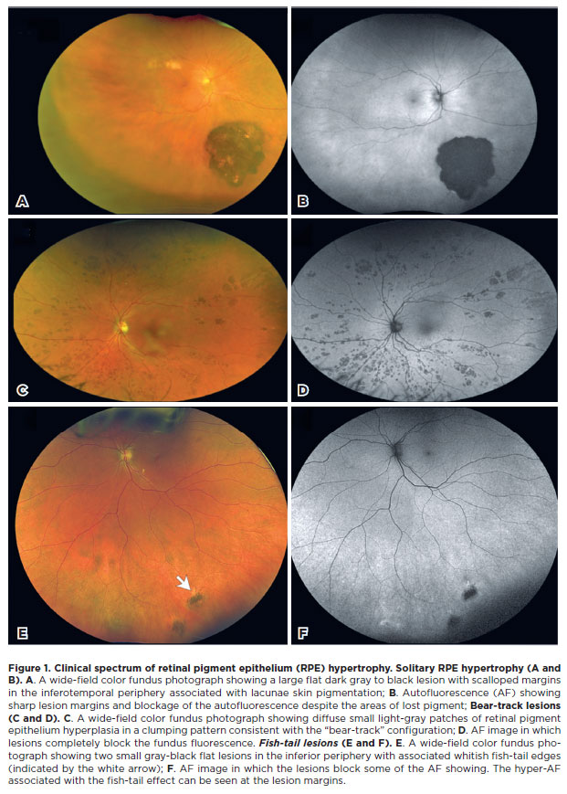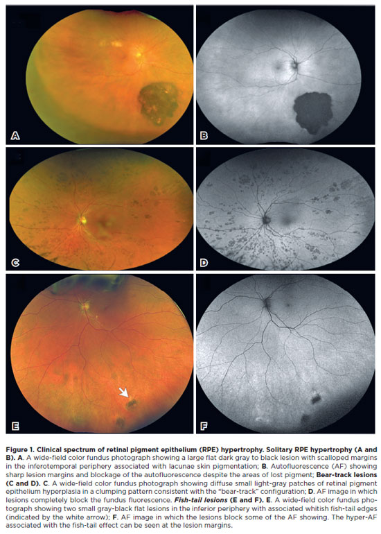 We read with great interest the article by Carvalho et al., describing the use of congenital hypertrophy of the retinal pigment epithelium (CHRPE) as a phenotypic marker for familial adenomatous polyposis (FAP)(1). The study highlights the importance of CHRPE as a risk factor for FAP, particularly in cases with bilateral fish-tail lesions(2,3). This is an informative and important finding that motivated us to add further insights into the clinical spectrum of retinal pigment epithelium (RPE) hypertrophy through a review of the three distinct presentations. Knowledge of these is critical for accurate diagnosis and differentiation.