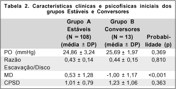 As características dos grupos no início do estudo mostram que apesar dos campos visuais serem considerados normais por critérios largamente utilizados na clínica (escore AGIS = 0 e GHT normal), uma diferença significativa de MD pode ser observada entre os dois grupos. Todavia, em se tratando de pacientes hipertensos oculares, observa-se o baixo valor médio inicial de MD, mesmo no grupo conversor (-1,00 ± 2,94). Os valores pressóricos, de escavação do disco e CPSD foram semelhantes nos dois grupos (Tabela 2).