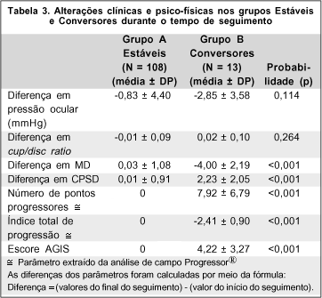 Os pacientes foram considerados progressores (tendo convertido para glaucoma perimétrico) caso apresentassem: (a) aumento mínimo de quatro pontos na escala AGIS (critério evolutivo utilizado em conformidade com o este estudo)(13) e/ou (b) dois, ou mais, pontos contíguos significativamente alterados na análise Progressor.