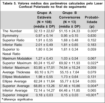 A tabela 4 demonstra as características do LCP no início do seguimentos para os dois grupos. Observa-se que uma grande parte dos parâmetros indicam diferenças significativas entre os grupos, entre eles destacam-se The Number, Maximum Modulation e Superior Average que permanecem significativamente diferentes entre os grupos do início até o último seguimento, após a conversão perimétrica (Tabela 5).