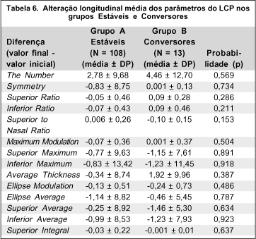 A subtração dos valores médios dos parâmetros do LCP no final e no início do seguimento estão dispostos na tabela 6, onde se observa que não ocorreu diferença significativa no ritmo de progressão dos grupos durante o período do estudo.