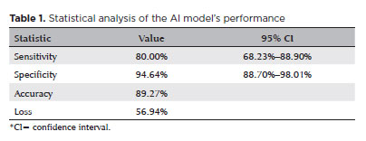 The sensitivity and specificity of the AI model were 80% (68.23%–88.9%) and 94.64% (88.8%–98%), respectively. Using the cross-entropy method, the accuracy and loss rate of the model were 89% and 0.56, respectively (Table 1, Figure 1).