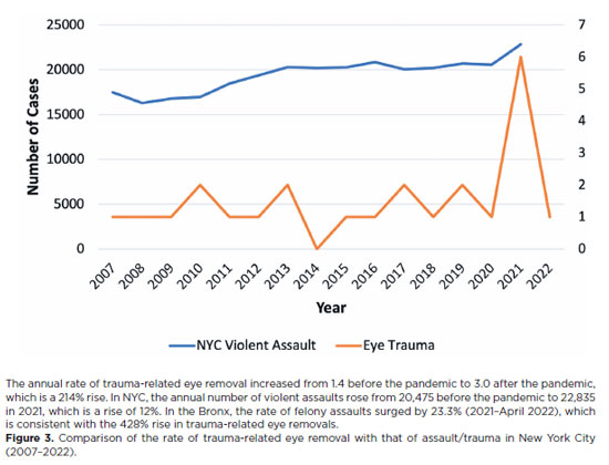 The annual rate of trauma-related eye removal increased from 1.4 before the pandemic to 3.0 after the pandemic, which is a 214% rise. In NYC, the annual number of violent assaults rose from 20,475 before the pandemic to 22,835 in 2021, which is a rise of 12%. In the Bronx, the rate of felony assaults surged by 23.3% (2021–April 2022), which is consistent with the 428% rise in trauma-related eye removals. Figure 3. Comparison of the rate of trauma-related eye removal with that of assault/trauma in New York City (2007–2022).