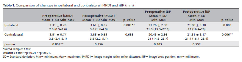 METHODS: Thirty patients with unilateral ptosis underwent Müller’s muscle conjunctival resection. Pre- and postoperative assessments included ipsilateral and contralateral side margin-reflex distance and brow position, measured through digital image analysis.