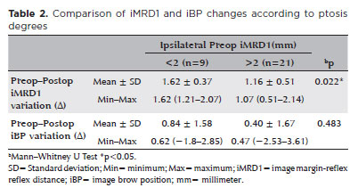 Although the change in ipsilateral iBP height in the moderate ptosis group was higher than in the mild ptosis group, the postoperative change rates were similar (p=0.483; p>0.05). When the ipsilateral preoperative iMRD1 values were classified based on a cutoff of 2, no statistically significant difference was found between the postoperative iBP difference values (Table 2).