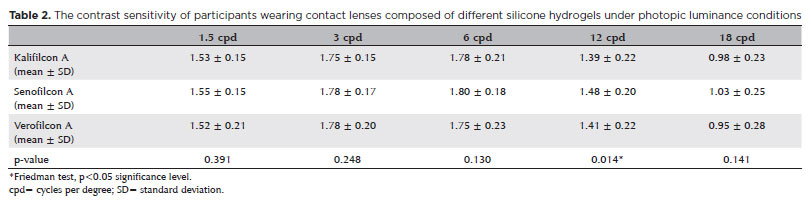 Another study evaluated contrast sensitivity in DDCL wearers under mesopic conditions and found no difference between senofilcon A and verofilcon A at low spatial frequencies but at 18cpd spatial frequency, contrast sensitivity of verofilcon A was higher than senofilcon A (p=0.037)(17). Although the difference was reported to be statistically significant, statistical significance may be possible if the p value was below 0.017 in the evaluation of 3 different DDCLs with post-hoc evaluation with Bonferroni correction(18). In our study, no significant difference was found among senofilcon A and verofilcon A at 18cpd spacial frequency under mesopic conditions. We found that contrast sensitivity with kalifilcon A was significantly higher than with verofilcon A at 3 cpd and with senofilcon A than verofilcon A at 12 cpd under mesopic conditions.
