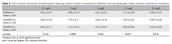 There were no statistically significant differences between the three different DDCLs at spatial frequencies of 1.5, 3, 6, and 18 cpd under photopic conditions (p=0.391, p=0.248, p=0.130, p=0.141, respectively). Contrast sensitivity was significantly higher with senofilcon A compared to kalifilcon A at a frequency of 12 cpd under photopic conditions (p=0.008). There was no significant difference between kalifilcon A and verofilcon A (p=0.446) or between senofilcon A and verofilcon A (p=0.021) (Table 2). There were no significant differences between the three different DDCLs at spatial frequencies of 1.5, 6, or 18 cpd under mesopic conditions (p=0.102, p=0.065, p=0.078). At 3 cpd under mesopic conditions, there was a statistically significant difference in contrast sensitivity with verofilcon A compared with kalifilcon A (p=0.001). There was no statistically significant difference between senofilcon A and kalifilcon A and between senofilcon A and verofilcon A at 3 cpd under mesopic conditions (p=0.632, p=0.028). At a frequency of 12 cpd, contrast sensitivity with senofilcon A was statistically significantly higher compared to verofilcon A (p=0.004), while there was no significant difference between senofilcon A and kalifilcon A (p=0.024) nor between verofilcon A and kalifilcon A (p=0.409) (Table 3).