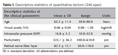 METHODS: This cross-sectional study included 174 patients (346 glaucomatous eyes) recruited from clinical records and routine follow-ups at a specialized ophthalmology center. Their mean age was 39–90 years, and 60.9% of them were women. Their quality of life and adherence were assessed using the NEI-VFQ25 and MMAS-8 questionnaires, respectively. Complementary tests included 24:2 visual field test, retinography, and optical coherence tomography. Patients diagnosed with glaucoma for at least 6 months were included, whereas pregnant patients and those with ocular diseases were excluded.