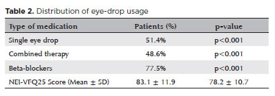The treatment duration was inversely associated with QoL, reflecting the cumulative burden of years of daily eye drop use. Mangione et al. found that QoL often declines at treatment initiation but improves over time as patients adjust. However, our findings indicate that some patients experience persistent negative effects, highlighting the need for individualized support throughout the treatment. Financial constraints and psychological stress may compound these effects, particularly in resource-limited settings(14).