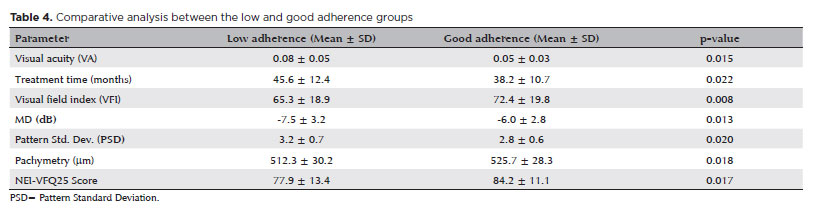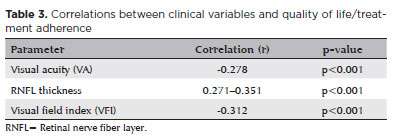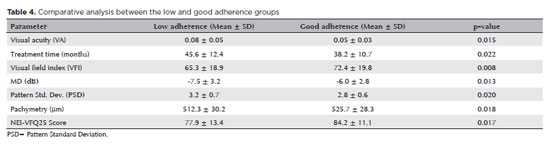 RESULTS: Among the participants, 59.2% adhered to the treatment whereas 40.8% showed low adherence. The mean quality of life score was 81.87. Patients with low adherence had slightly higher quality of life scores (mean 83.1) than those with good adherence (mean 81.0), but the difference was not statistically significant. Disease severity was associated with increased optic nerve cupping, reduced thickness of the nerve fiber and ganglion cell layers, and great visual field loss. No significant correlation was observed between adherence and quality of life, indicating the independence of these factors and the influence of psychological or social elements.