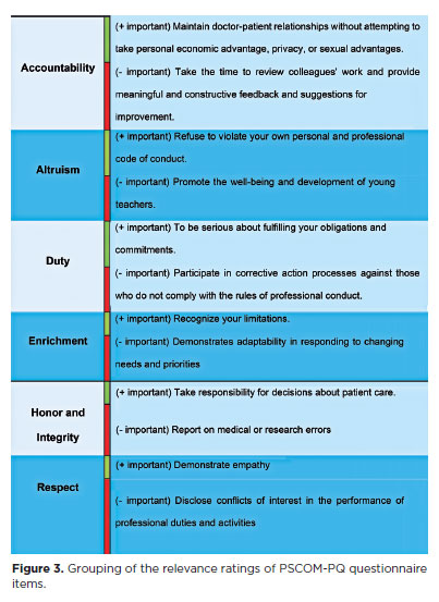 In our study, the PSCOM-PQ items rated as most relevant were as follows: (i) maintaining doctor-patient relationships that avoid exploitation for personal financial gain, privacy, or sexual advantage, (ii) refusing to breach one’s personal and professional code of conduct, (iii) fulfilling commitments and obligations conscientiously, and (iv) acknowledging one’s own limitations. These results highlight a focus on the patient, responsibility, and professional humility.