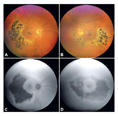 A 58-year-old woman presented with bilateral, asymmetric sector retinitis pigmentosa (RP) (Figure A, B). Fundus autofluorescence imaging revealed hyperautofluorescent rings surrounding hypoautofluorescent regions corresponding to bone spicule pigmentation and retinal degeneration (Figure C, D). The left eye also exhibited nuclear cataract–induced media opacities. Despite the asymmetry, macular integrity was relatively well-preserved in both eyes. Asymmetric and sector RP is a rare variant of the disease characterized by localized retinal involvement, typically affecting specific quadrants and displaying less symmetry compared with the classic diffuse form of RP(1,2).
