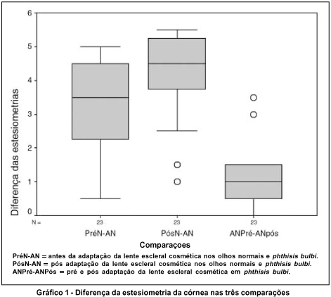 A análise estatística foi feita com o teste de t de Student para amostras relacionadas, no qual comparamos a sensibilidade tátil corneal média dos olhos normais com phthisis bulbi antes da adaptação da LEC, olhos normais com phthisis bulbi após LEC e phthisis bulbi antes e após a adaptação da LEC. O nível de significância foi de 0,05(11). O gráfico feito foi do tipo "box-plot".