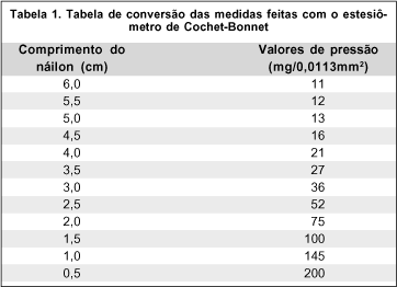 A sensibilidade tátil foi determinada pela pressão exercida pelo monofilamento de náilon, colocado em contato perpendicular à córnea, a 2 mm do limbo temporal. Iniciava-se o exame com a menor pressão e continuava de modo progressivo até o paciente piscar ou informar a sensação de toque do monofilamento.