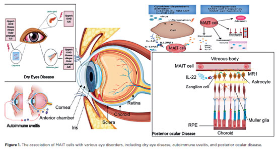 Owing to their unique utilization of TCR, these cells are pivotal in the immune system's defense against microbial infections, and are associated with autoimmune conditions like uveitis and other inflammatory diseases affecting the eyes. Depending on the microenvironment and specific antigens, MAIT cells can exert proinflammatory and regulatory effects. In autoimmune uveitis, they can promote tissue damage through cytokine release, whereas in other contexts, they may help regulate immune cell activity and maintain ocular immune tolerance. Recent studies highlight the potential therapeutic benefits of modulating MAIT cell activity in ocular autoimmune disorders, suggesting that fine-tuning their functionality could alleviate disease symptoms and improve patient outcomes(1).