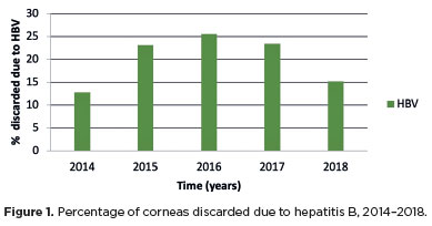 RESULTS: Of the 1,968 corneas processed, 897 (45.57%) were discarded. Among these, 333 (37.12%) tested positive for serological markers. Hepatitis B accounted for 34.67% of positive cases (15% of total donations), hepatitis C for 1.11% (0.50% of total), and HIV for 0.89% (0.4% of total). Hepatitis cases remained stable between 2014 and 2016, with a marked decline in 2017 and 2018. Most discarded corneas were positive for anti-HBc (31.88%) and negative for HBsAg; however, the anti-HBs test was not performed to confirm immunity to the hepatitis B virus.