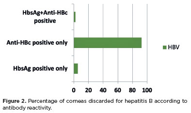 During the study period, 1,968 corneas were processed, of which 897 (45.57%) were discarded. Reasons for discard included reactive results for HBsAg or anti-HBc, positive tests for anti-HCV and HIV 1 and 2, absence of serological data, poor tissue quality, and contamination. Of these, 333 corneas were excluded due to positive serological results, representing 37.12% (333/897) of all discarded corneas.