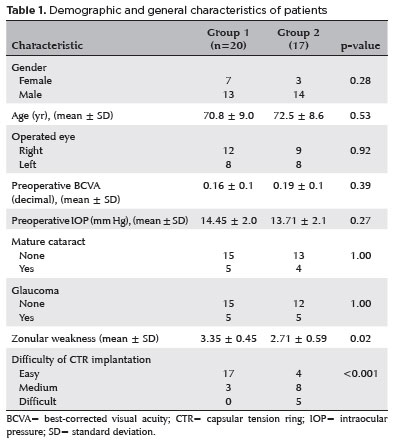 RESULTS: Group 1 and 2 comprised 20 and 17 patients, respectively. There were no significant differences between the groups in age, sex distribution, and presence of glaucoma (p=0.53, p=0.28, and p=1.00, respectively). The mean zonular weakness score was significantly higher in Group 1 (3.35 ± 0.45) than in Group 2 (2.71 ± 0.59; p=0.02). Capsular tension ring implantation was significantly easier in the iris retractor group (p<0.001).