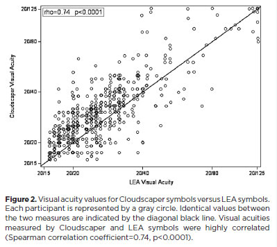 RESULTS: The mean logMAR visual acuity with LEA symbols was 0.12 (standard deviation [SD]=0.18; range, -0.10 to 0.80), while with Cloudscaper symbols it was 0.18 (SD=0.19; range, -0.10 to 0.80). The mean difference between Cloudscaper symbols and LEA symbols was 0.099 logMAR (approximately 0.5 optotypes; SD=0.08; range, 0.0-0.14; p<0.0001). Cloudscaper symbols slightly underestimated visual acuity compared to LEA symbols. Visual acuity measured by both methods was highly correlated (Spearman's r=0.74, p<0.0001). The mean visual acuity difference between Cloudscaper symbols and the Snellen E chart was 0.0045 (p=0.805; 95% confidence interval [95% CI]), whereas the difference between LEA symbols and Snellen E was 0.0883 (p<0.001; 95% CI).