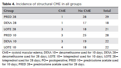 RESULTS: A total of 140 eyes from 140 patients were analyzed (29 prednisolone acetate 1.0%, 18 dexamethasone 1.0%, and 21 loteprednol etabonate 0.5% for 28 days; 28 prednisolone acetate 1.0%, 22 dexamethasone 1.0%, and 22 loteprednol etabonate 0.5% for 10 days). No significant differences were found among the six groups during follow-up. However, eyes treated with dexamethasone (1.0%) showed greater intraocular pressure fluctuations, particularly on Days 7 and 30, and a higher incidence of rebound inflammation in the 28-day regimen. Structural cystoid macular edema without visual impact was observed in 5.9% of eyes in the 28-day groups and 14.2% of eyes in the 10-day groups, as detected by optical coherence tomography at 30 days.