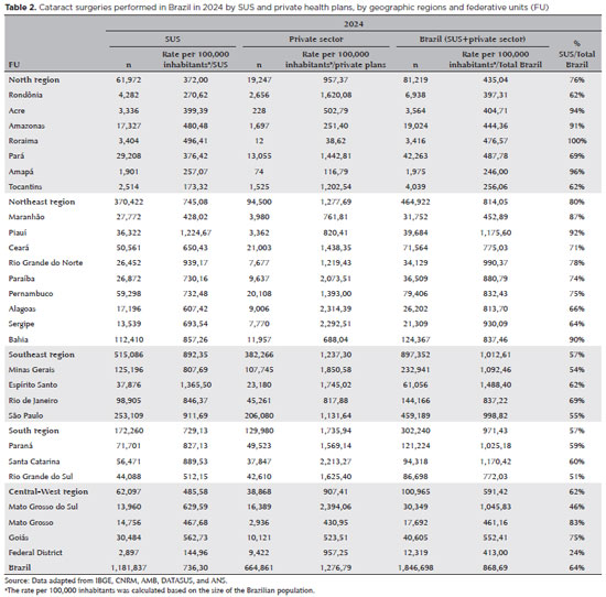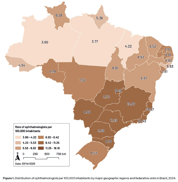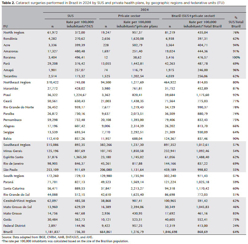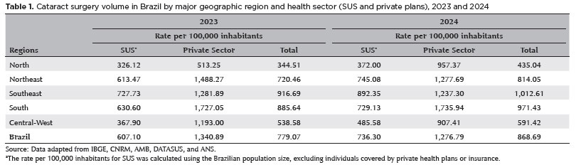 RESULTS: Brazil has 16,784 ophthalmologists, representing 8.96 specialists per 100,000 inhabitants. Marked disparities were observed: large cities (>500,000 inhabitants) had 18.75 ophthalmologists per 100,000 residents, whereas municipalities with <50,000 inhabitants had fewer than one. Across federative units, physician density ranged from 19.18 per 100,000 in the Federal District to 4.22 in Maranhão. In 2024, cataract surgery rates varied widely, from 1,012.61 per 100,000 inhabitants in the Southeast to 435.00 in the North. Nationally, Unified Health System performed 736.30 surgeries per 100,000 inhabitants, compared with 1,276.79 in the private sector. On average, each ophthalmologist performed 96.92 cataract surgeries annually.