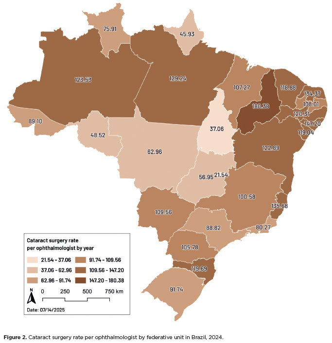 Cataract surgery rates per ophthalmologist were also calculated according to the federative units of Brazil.