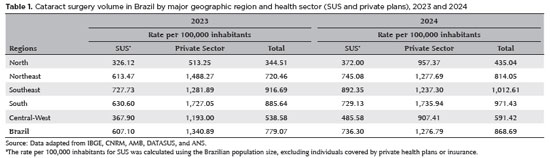 The volume of cataract surgeries performed in Brazil in 2023 and 2024 was obtained from two official data sources: DATASUS(7), which records procedures within the universal public healthcare system (SUS), and the National Supplementary Health Agency (ANS), which compiles procedures and payments reported by private health insurance operators(8).