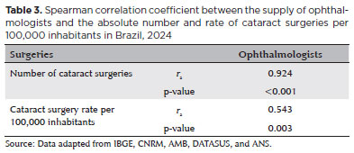 METHODS: Data on ophthalmologists were obtained from the National Medical Residency Commission and the Associação Múdica Brasileira. Information on cataract surgeries performed through the Unified Health System was collected from the DATASUS database, while data on procedures covered by private health plans were retrieved from the National Supplementary Health Agency. Population estimates from the 2024 Demographic Census of the Brazilian Institute of Geography and Statistics were used to calculate physician density and surgery rates per 100,000 inhabitants. Associations between the number of ophthalmologists and cataract surgery volume were analyzed using Spearman's correlation coefficient.