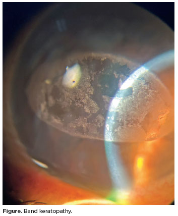 Band keratopathy (Figure) is a degenerative disease localized in the interpalpebral aperture(1). It consists of band-shaped fine calcium deposits in the anterior corneal layers(2). Its mechanism is unknown(1). Early stages are asymptomatic(2); however, over time, common complaints include a sensation of a foreign body in the eye, lachrymation, photophobia, visual acuity deterioration, and glare(1). Treatment aims to restore corneal surface, including mechanical debridement, superficial keratectomy, ethylenediaminetetraacetic acid chelation, and phototherapeutic keratectomy(2).