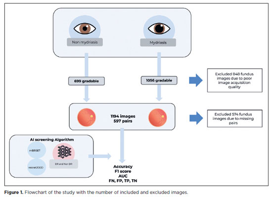 METHODS: The proportions of gradable images were compared between mydriatic and non-mydriatic groups. Generalized estimating equations were used to identify factors associated with image gradability, including age, sex, race, diabetes duration, and systemic hypertension. A ResNet-200d model was trained on the mobile Brazilian Ophthalmological dataset and externally validated on both mydriatic and non-mydriatic images. Model performance was evaluated using accuracy, F1 score, area under the curve, and confusion matrix metrics. Sensitivity differences were assessed using the McNemar test, and area under the curves were compared using DeLong's test. The Youden index was used to determine optimal classification thresholds. Agreement between macula- and disc-centered images was analyzed using Cohen's κ.
