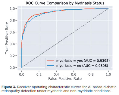 These results underscore the benefits of mydriasis in improving image quality and diagnostic accuracy, particularly in settings where high-quality images are critical for early DR detection. The lower false positive rate in the mydriatic group implies that pupil dilation may reduce overdiagnosis, thereby increasing screening specificity.