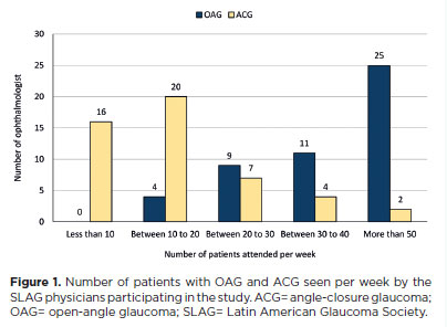 With respect to research involvement in glaucoma, 16 physicians (32.6%) reported exclusive participation in surgical research, 13 (26.5%) in clinical research, and 20 (40.9%) in both clinical and surgical research. When asked about the most frequently encountered type of glaucoma, most physicians indicated that they see more patients with OAG than with ACG every week (Figure 1).