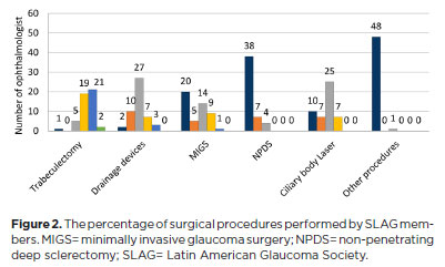 Between 2009 and 2010, and again in 2013, a study was conducted to assess the level of consensus among glaucoma specialists in Latin America regarding specific aspects of diagnosis and medical management(15). Forty-eight physicians from 11 Latin American countries, along with two from the United States and Puerto Rico, participated. Similar to the present study, an electronic questionnaire was used, and the participant demographics were comparable, including 31 SLAG members and 19 non-members. A key distinction, however, is that the present study focuses on surgical procedures – many of which were either unavailable or rarely used in Latin America 15 yr ago.