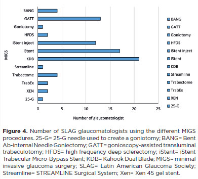 CONCLUSION: Among specialists of the Latin American Glaucoma Society, trabeculectomy and glaucoma drainage devices remain the most commonly performed surgical procedures. Minimally invasive glaucoma surgery is primarily used in combination with cataract surgery, while ciliary body laser procedures are generally reserved for cases of previous glaucoma drainage device failure or as an initial option for newly diagnosed glaucoma cases.